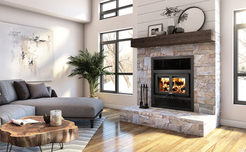 Made with care in Quebec, this easy-to-use non-catalytic wood fireplace has retractable cast iron double doors that you can enhance with a firescreen door to fully experience the crackle of the wood fire. A black or brushed nickel overlay is available for your convenience.