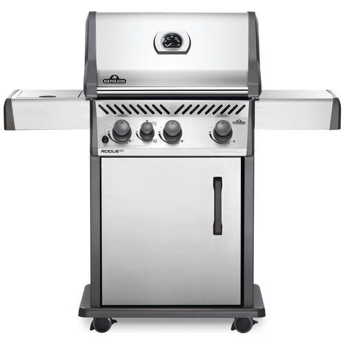 Napoleon's Rogue XT 425 Stainless Steel Propane Gas Grill with Infrared Side Burner has three burners, stainless steel grids and a high top lid. This grill lights easily, every time, with a battery-free ignition. Grill the perfect steak using the integrated sizzle zone side burner or use it to make sauces and sides while grilling, and searing on the main area. The durable materials are both stylish and easy to maintain.
