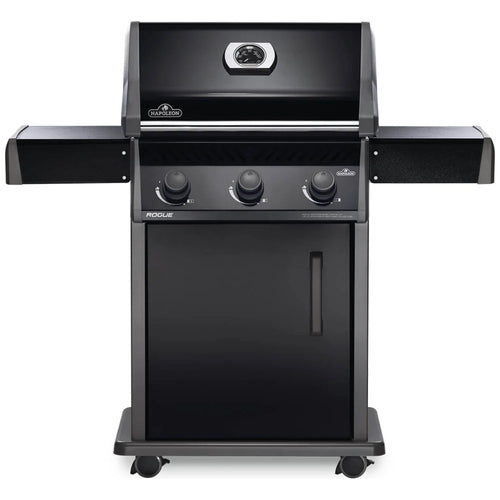 Napoleons Rogue 425 Propane Gas Grill in black, is a premium quality gas grill with an affordable price. Three burners light every time with a battery-free ignition. This grill boasts precise temperature control, high heat searing over cast iron cooking grids and stainless steel sear plates for even heating and to keep your grill clean. The stylish black exterior is highly durable and easy to clean.